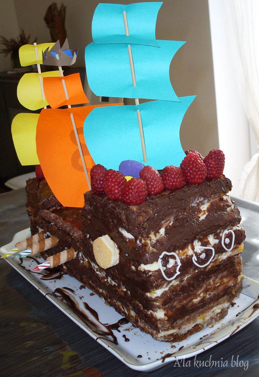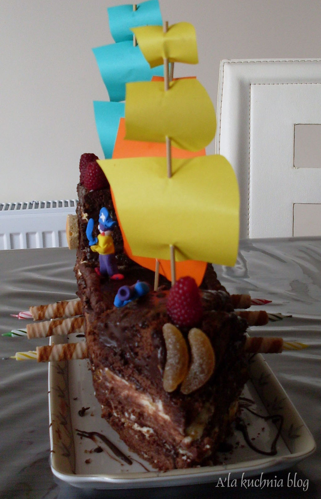 Nie ma to jak zachwycony wzrok Dziecka, kiedy widzi swój tort urodzinowy. Ciasto dla Dzieci moim zdaniem powinno być lekkie i niezbyt słodkie, za to może przybierać dowolne kształty. Na 2 urodzinki Synka powstał czekoladowy tort biszkoptowy z bitą śmietaną i brzoskwiniami w kształcie statku pirackiego.