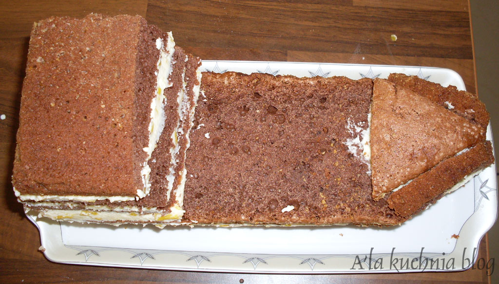 Z ciasta wyciąć elementy statku, przekroić na 2 placki (tak, żeby były 2 warstwy do przełożenia - u mnie kadłub, nadbudówka, dziób), posmarować bitą śmietaną. Wstawić na 1 h do lodówki. Wychłodzone ciasto polać czekoladą i udekorować wg uznania. Smacznego