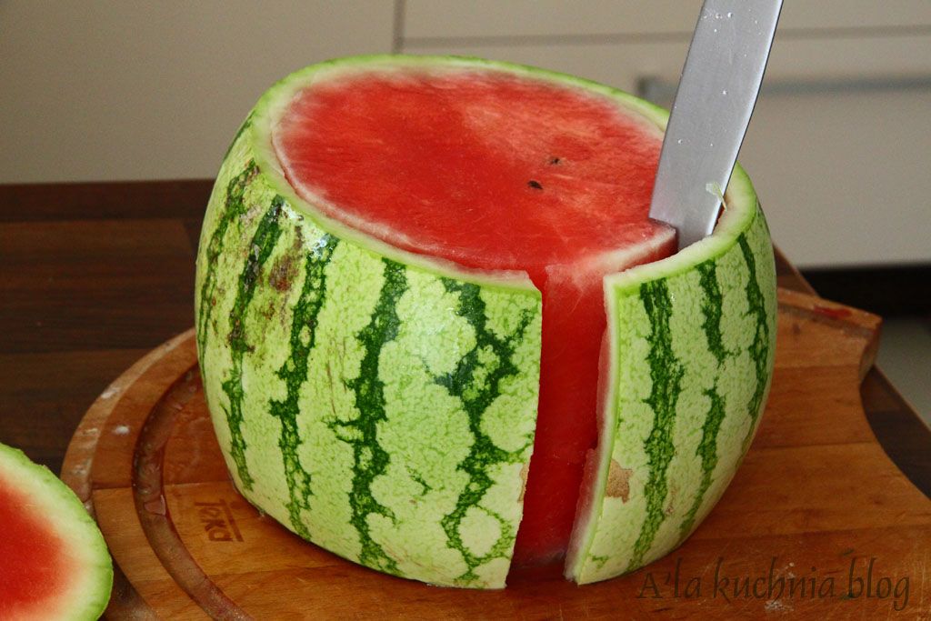 Od arbuza odcinamy górę i dół, a następnie wykrawamy ze skórki, tak by powstał walec.
