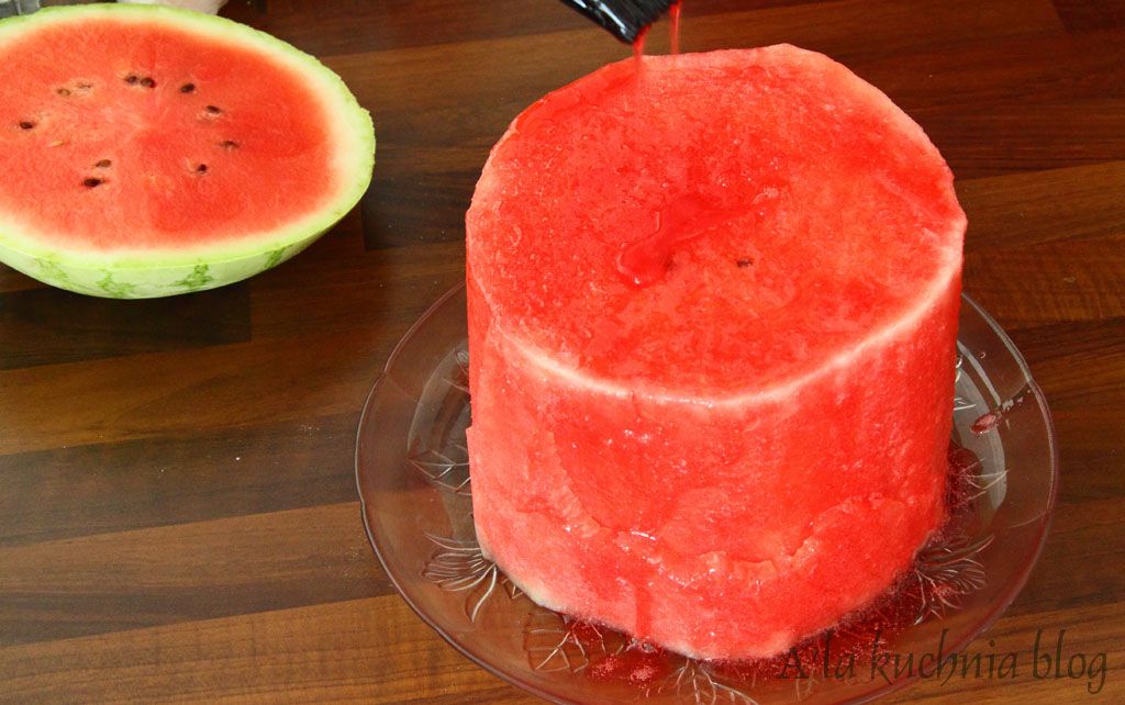 Obkładamy arbuza na kilka minut grubym ręcznikiem papierowym, by zdjąć nadmiar soku –ręcznik nie powinien podrzeć się na owocu. Po odjęciu ręcznika arbuz jest „suchy”. Pędzelkiem rozsmarowujemy dokładnie na naszym torcie galaretkę (łącznie z talerzykiem na którym arbuz stoi). Wstawiamy do lodówki, aby galaretka całkowicie stężała.