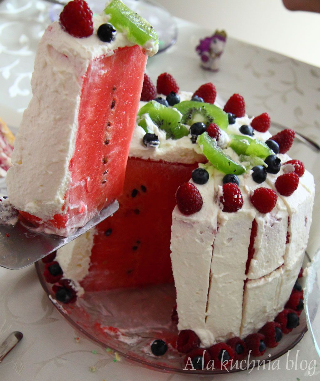 tort arbuzowy orzeźwiający owocowy bita śmietana galaretka urodzinowy  Zaskoczenie na twarzach gości – bezcenne. Ale ten tort jest wart zrobienia, nie tylko z tego powodu. Jest fantastycznie orzeźwiający, gasi pragnienie, rewelacyjnie smakuje i zrobił większą furorę niż tort Ninjago. Haha