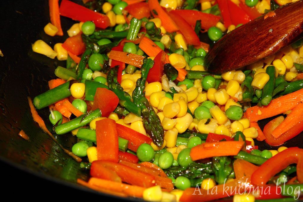 Chińska kuchnia jest jedną z najbardziej dietetycznych kuchni świata. Do kurczaka po chińsku często serwowany jest ryż lub makaron z warzywami. Ponieważ w dniu dzisiejszym postanowiłam zrobić danie bezmięsne, do ryżu obok warzyw dodałam jajko. Sprawdziło się doskonale. Powstało bardzo sycące, kolorowe i smakowite danie, które przyrządza się w oka mgnieniu.