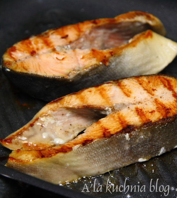 Łososia skrapiamy z obu stron sokiem z cytryny, solimy i oprószamy pieprzem – odstawiamy na 10 minut. Po czym grillujemy na patelni lub w piekarniku (ok. 4 min z każdej strony na patelni grillowej, w piekarniku ok. 15-20 min).