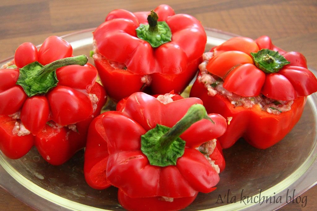 Paprykę dokładnie myjemy, odcinamy górę z ogonkiem i usuwamy pestki. Mięso mielone łączymy z przyprawami, jajkiem, bułką odciśniętą z nadmiaru mleka, czosnkiem i cebulą – wyrabiamy jak na kotlety mielone.