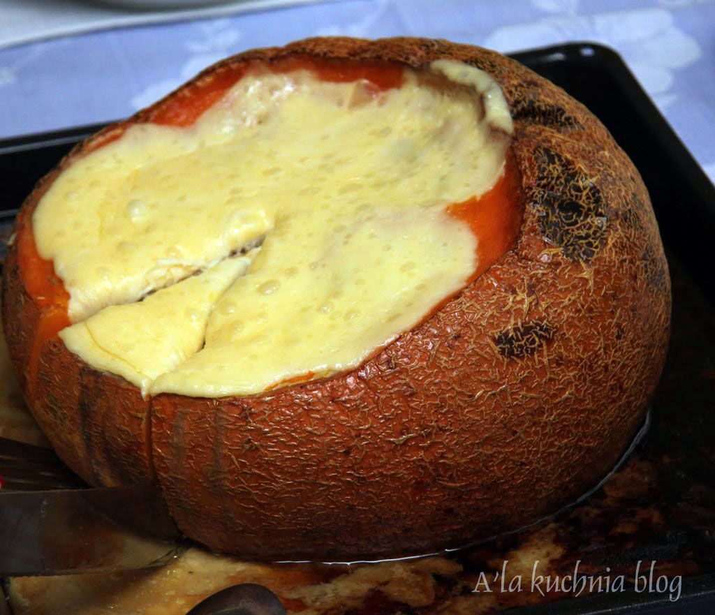 Zdejmujemy „kapelusik dyniowy” i na górę kładziemy plastry sera. Pieczemy jeszcze ok. 10 minut, aż ser się ładnie rozpuści.