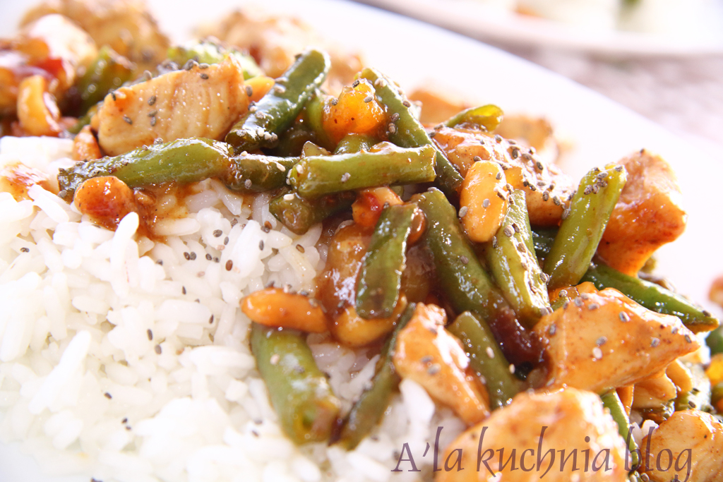 Dodajemy kilka łyżek gotowego sosu chutney z mango i mieszamy dokładnie, tak by sos pokrył mięso i fasolkę.