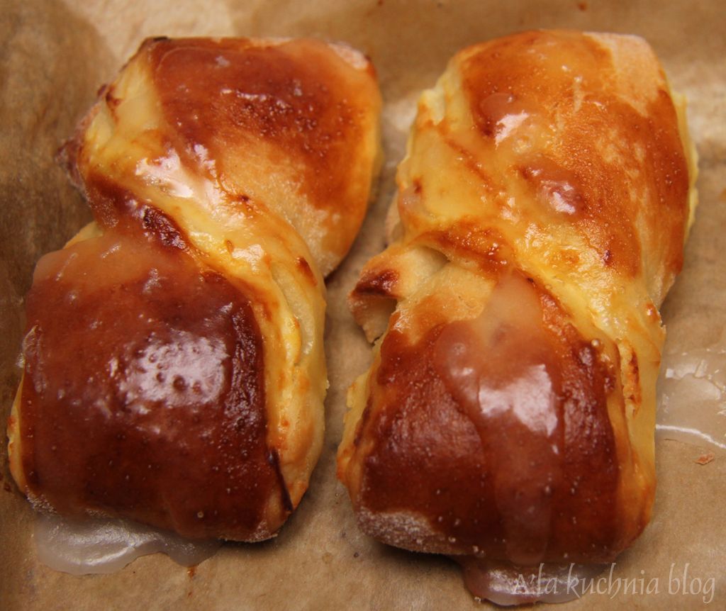 Po wyjęciu z piekarnika lekko przestudzamy drożdżówki, a następnie polewamy je lukrem zrobionym z wymieszanego cukru pudru z sokiem z cytryny. Drożdżówki smarujemy 1 jajkiem rozmąconym z 1 łyżką wody. Pieczemy ok. 25 min w 180 st. C.