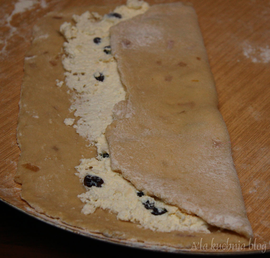 Ciasto lekko odgazować, naciskając delikatnie płasko dłonią, podzielić na 2 części. Każdą rozwałkowujemy na prostokąt i smarujemy połową sera. Składamy na zakładkę do środka - na 2. Następnie kroimy na prostokąty o szerokości ok. 5 cm. Każdy prostokąt następnie skręcamy tak, by powstała „muszka” ( jak w męskim stroju). Odstawiamy na kolejne 15 min do wyrośnięcia.