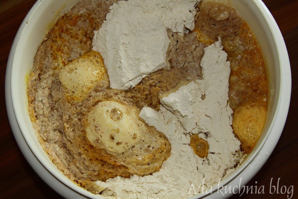 Wszystkie składniki na ciasto wrzucamy do miski w podanej powyżej kolejności. Odstawiamy na 3 godziny, nie koniecznie pod przykryciem i nie koniecznie w ciepłe miejsce.