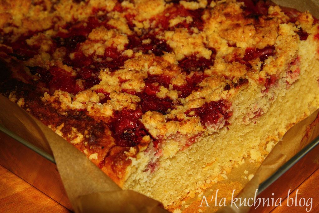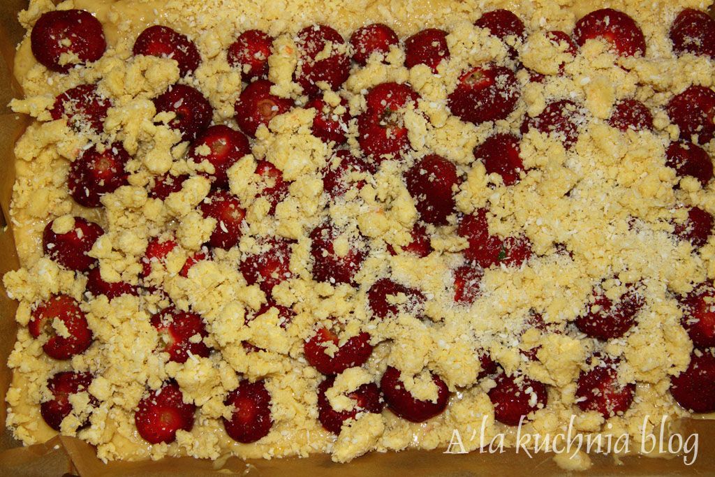 Na ciasto wykładamy truskawki i posypujemy kruszonką.