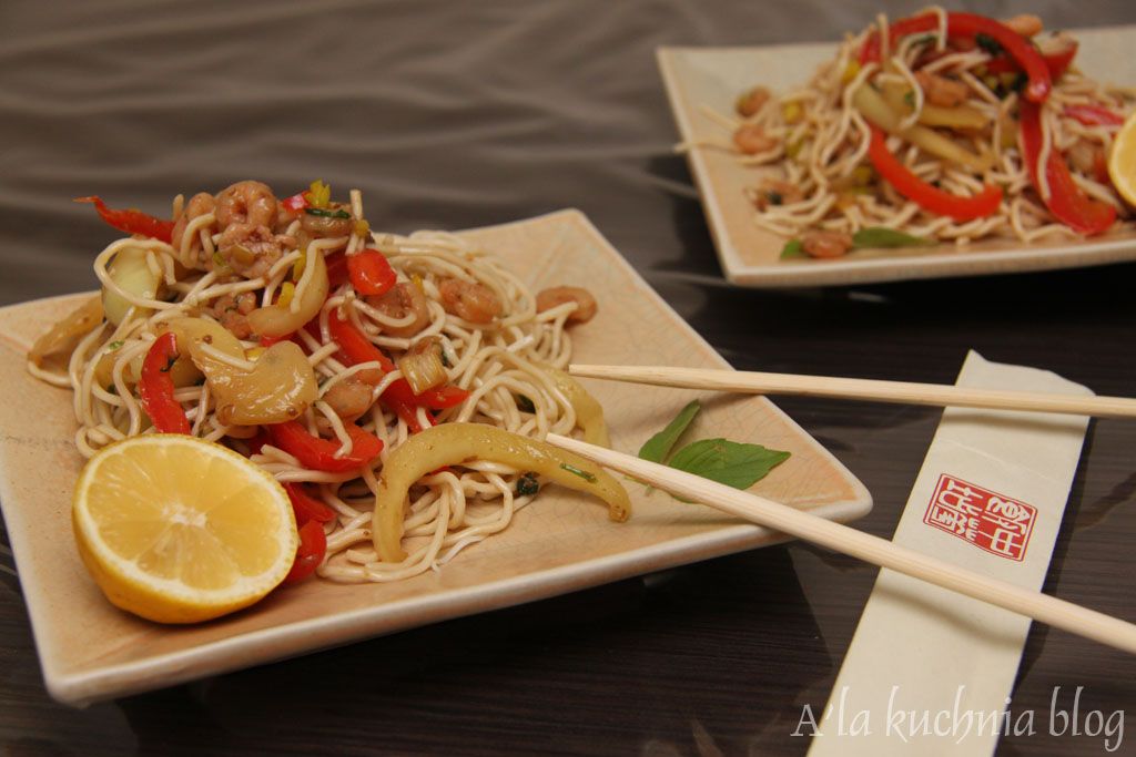 statnio mam ochotę na dania azjatyckie, bo po pierwsze są mało kaloryczne, po drugie szybko się je przyrządza, a po trzecie niebiańsko smakują. Moje Maluszki lubią używać pałeczek do jedzenia, więc dziś na kolację przygotowałam dla Nich makaron po azjatycku z krewetkami.