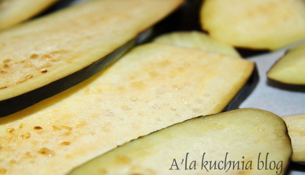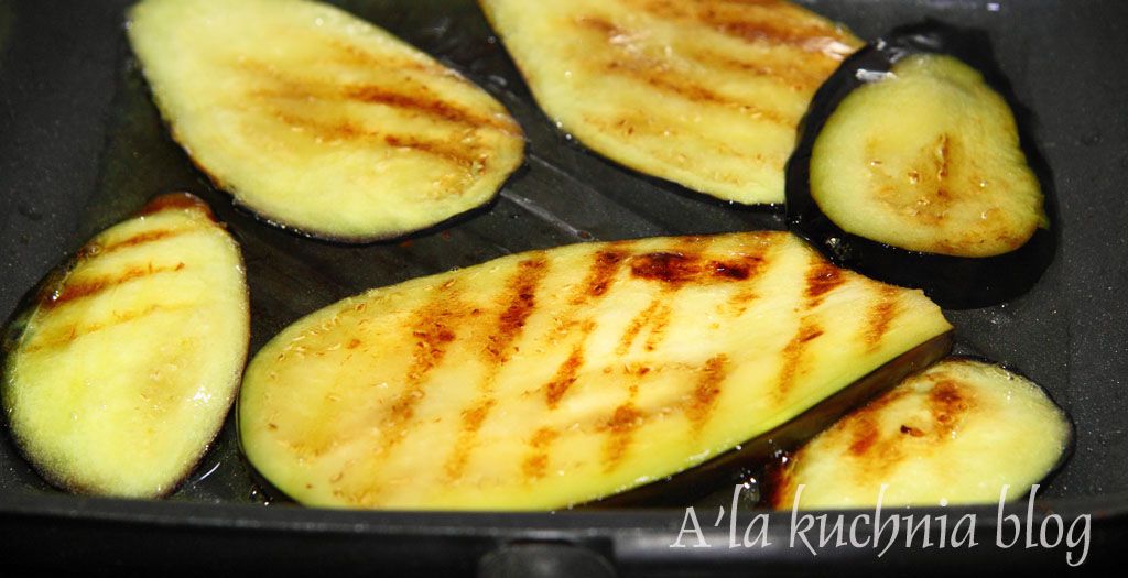 Bakłażana myjemy i kroimy w ok. 4 m plastry. Solimy i odstawiamy na min 20 minut. Bakłażan się „spoci” i odda cała swoja goryczkę. Następnie ręcznikiem papierowym zbieramy wodę z bakłażana i grillujemy go na patelni (można ewentualnie posmarować patelnię odrobina oliwy lub oleju przed grilowaniem).