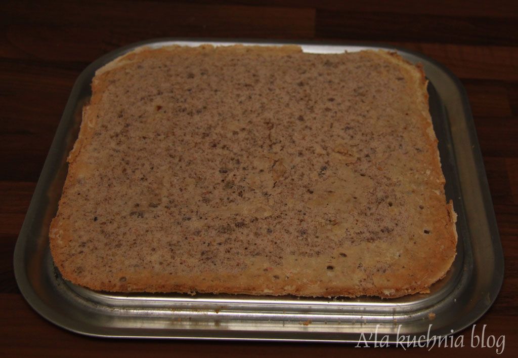 Z podanych składników na ciasto pieczemy biszkopt. Białka ubijamy na sztywno ze szczyptą soli, potem dodajemy po jednym żółtku- ciągle miksujemy. Dodajemy proszek wymieszany z makami i orzechami – dokłądnie mieszamy. Na końcu dodajemy wystudzony tłuszcz i raz jeszcze przez chwilę mieszamy do połączenia składników. Pieczemy 40 minut w 190stC.