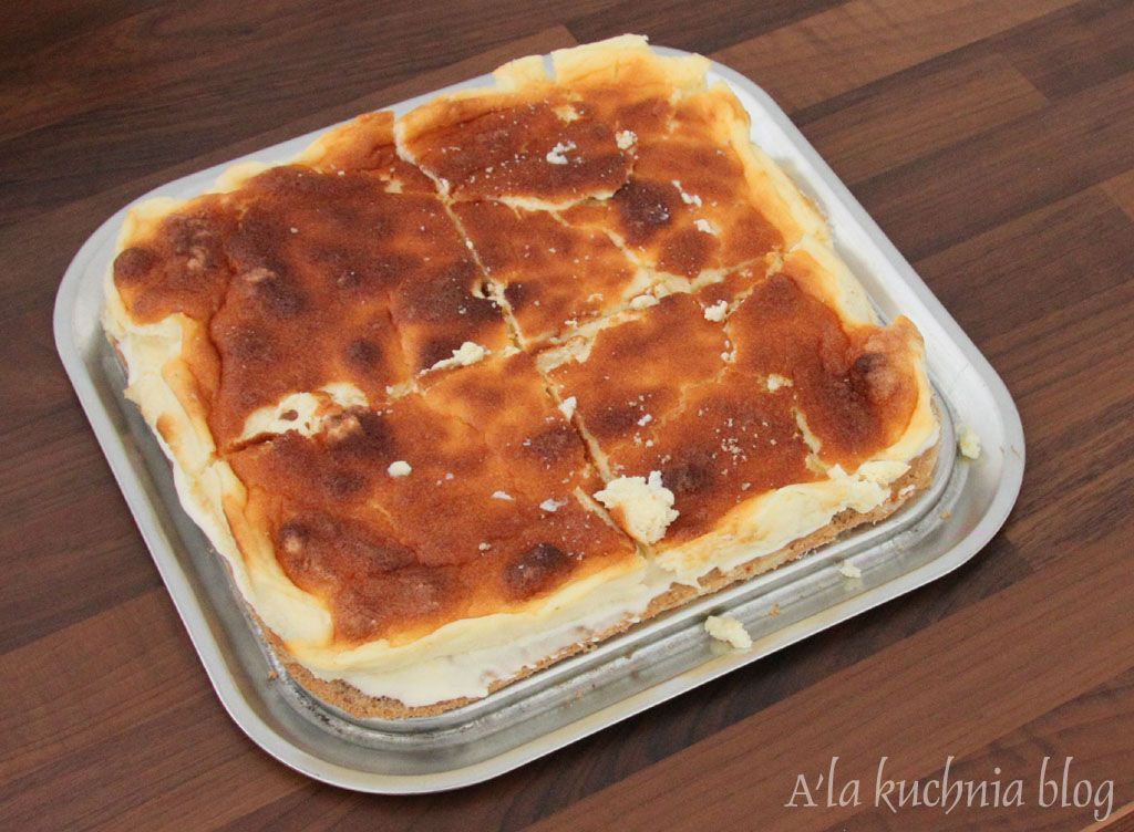Na masę wykładamy upieczony sernik (można go przekroić na mniejsze kawałki- łatwiej się wtedy przekłada).