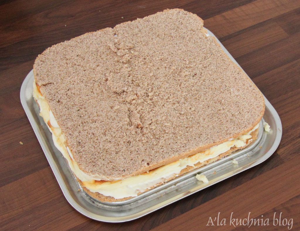 Na masę wykładamy drugi blat orzechowo-biszkoptowy.