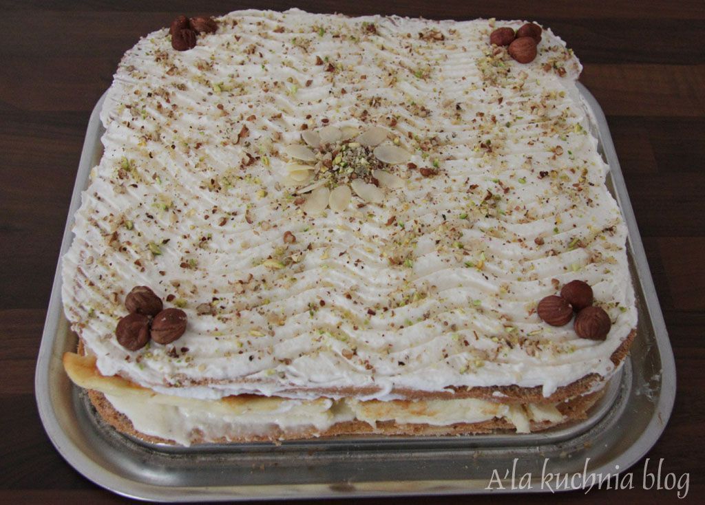 Na koniec smarujemy wierzch ciasta pozostałą masą śmietanową, posypujemy zmielonymi orzechami.