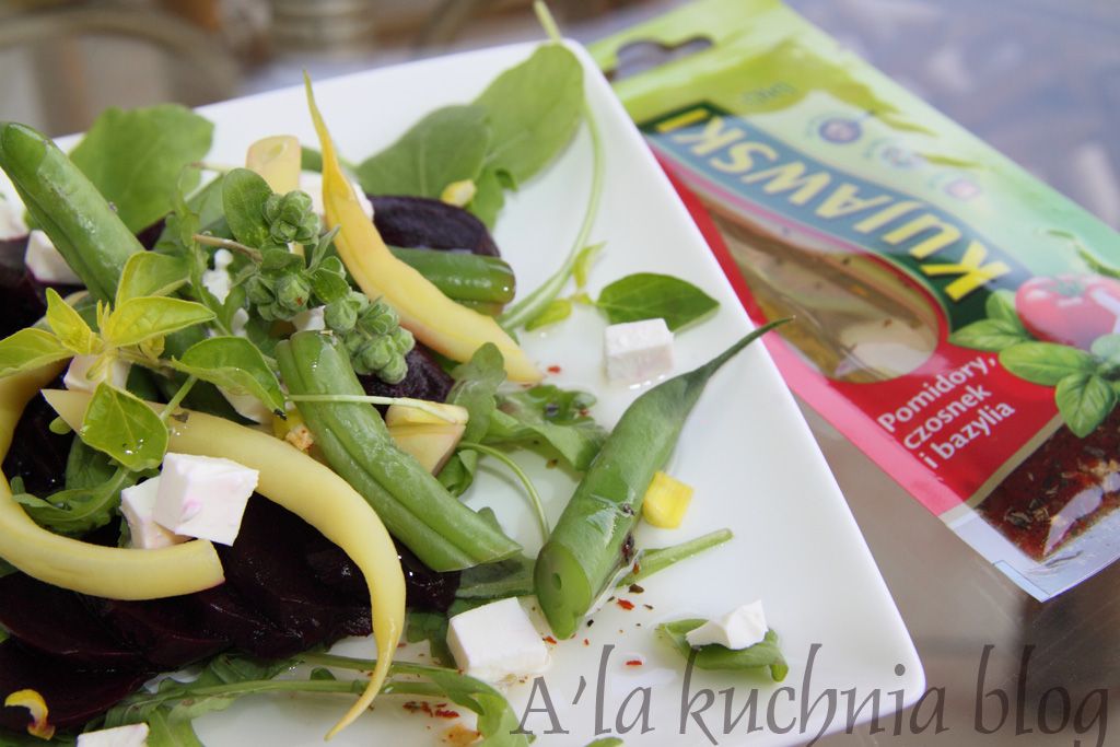 Dzięki uprzejmości ZT Kruszwica mam przyjemność wypróbować super saszetki smakowego oleju Kujawskiego. Nie tylko do smażenia, ale i do sałatek jest doskonały, a przy tym zajmuje mało miejsca i można zabrać go wszędzie: na piknik, camping czy po prostu używać na co dzień w kuchni. Za oknem piękna i upalna pogoda, więc szkoda czasu na długie stanie w kuchni, dlatego moja propozycja na obiad lub kolację to sałatka z buraków i fasolki szparagowej.